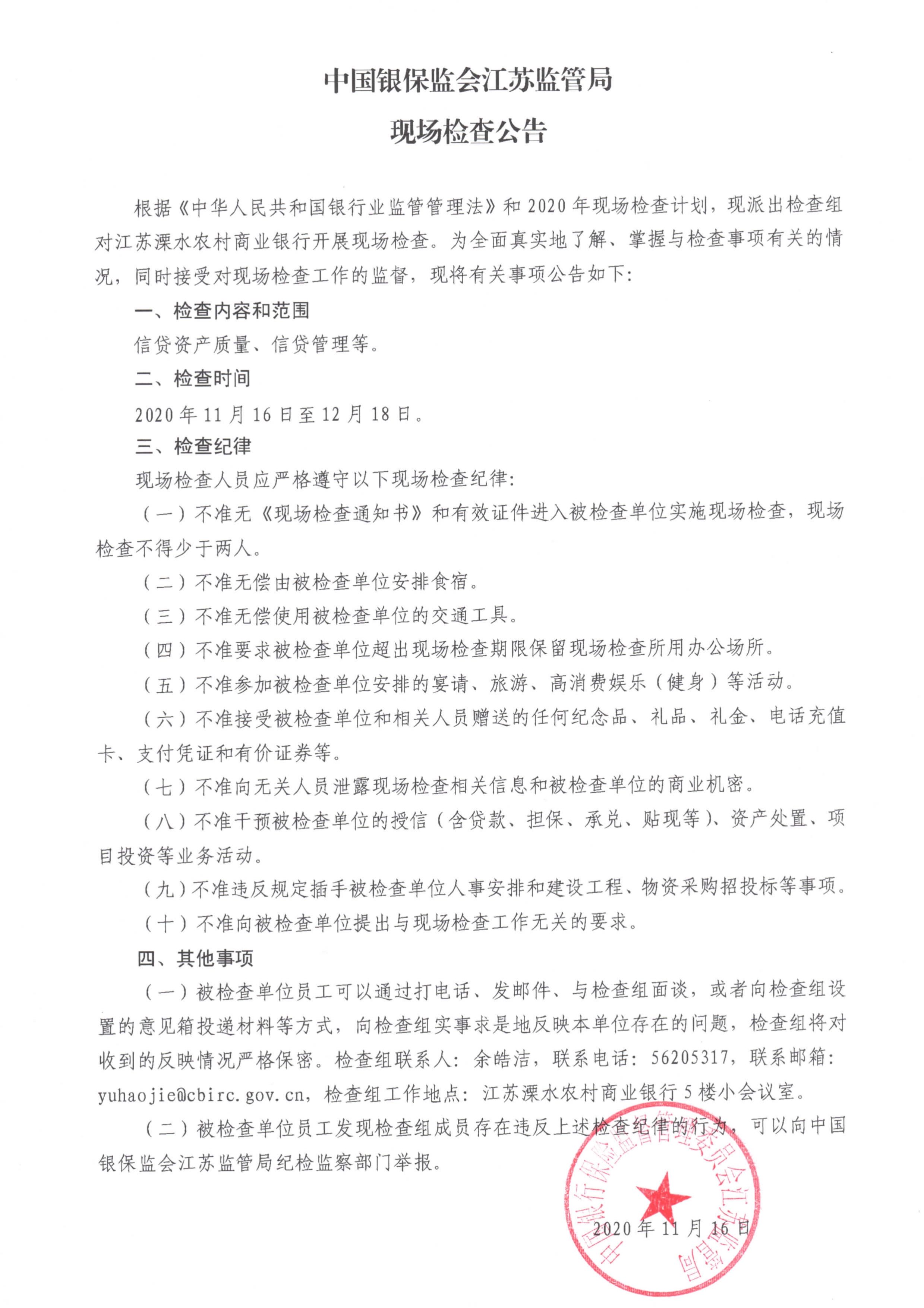 中国银保监会江苏监管局现场检查公告